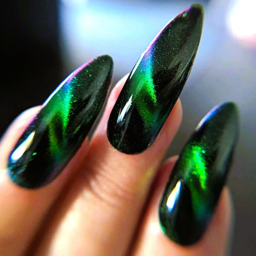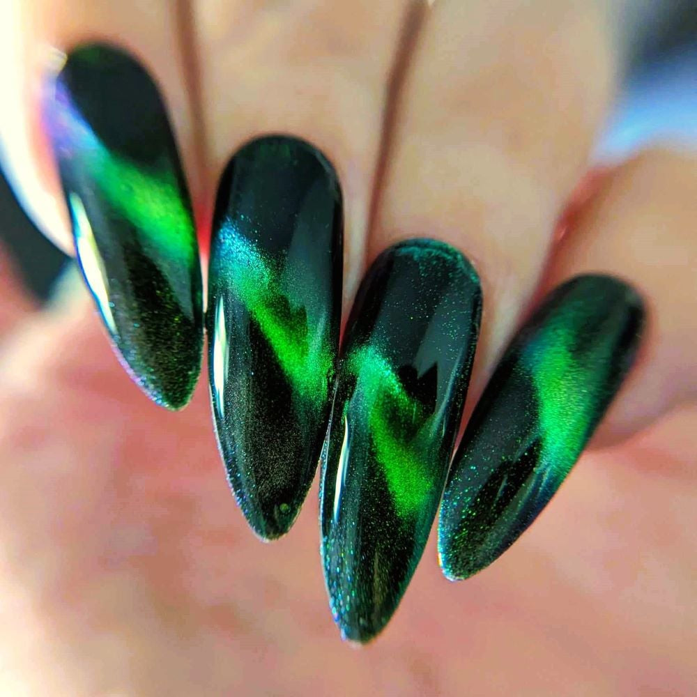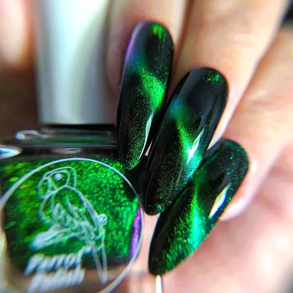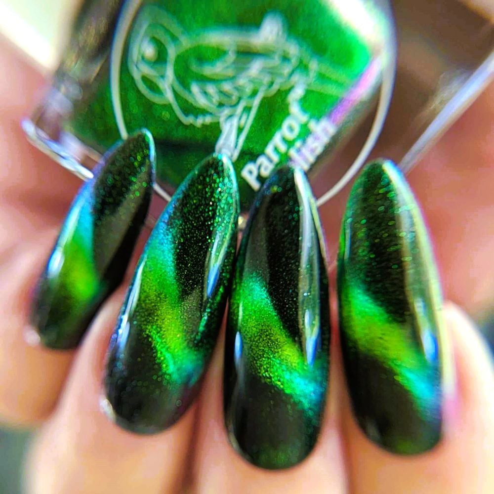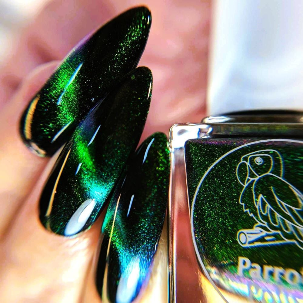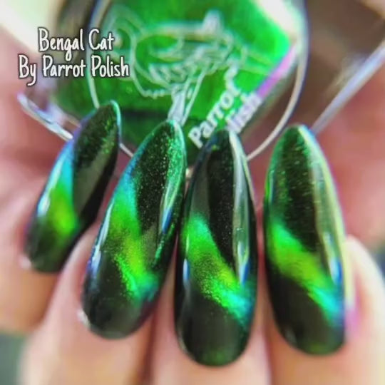 Parrot Polish "Bengal Cat" Multichrome Magnetic Nail Polish Green/Purple/Blue. An eye catching magnetic multichrome that moves from Green/ Purple and several other colors, based on the lighting. Please use a Neodymium magnet for best results. 2-3 coats and a top coat is all you need.