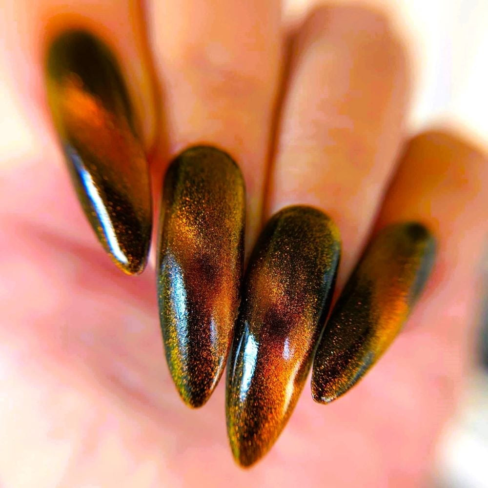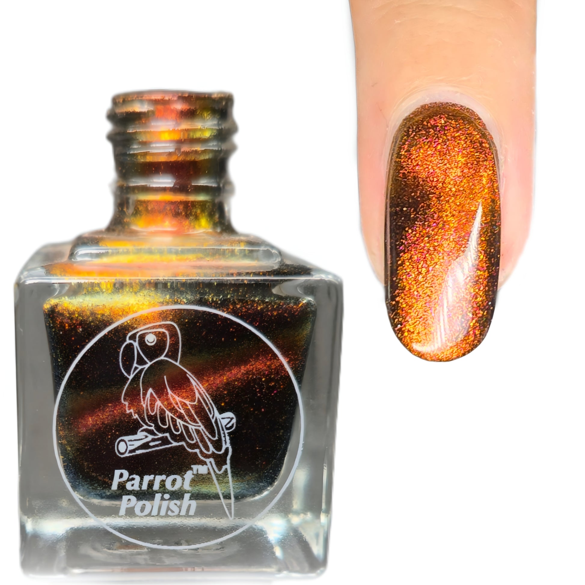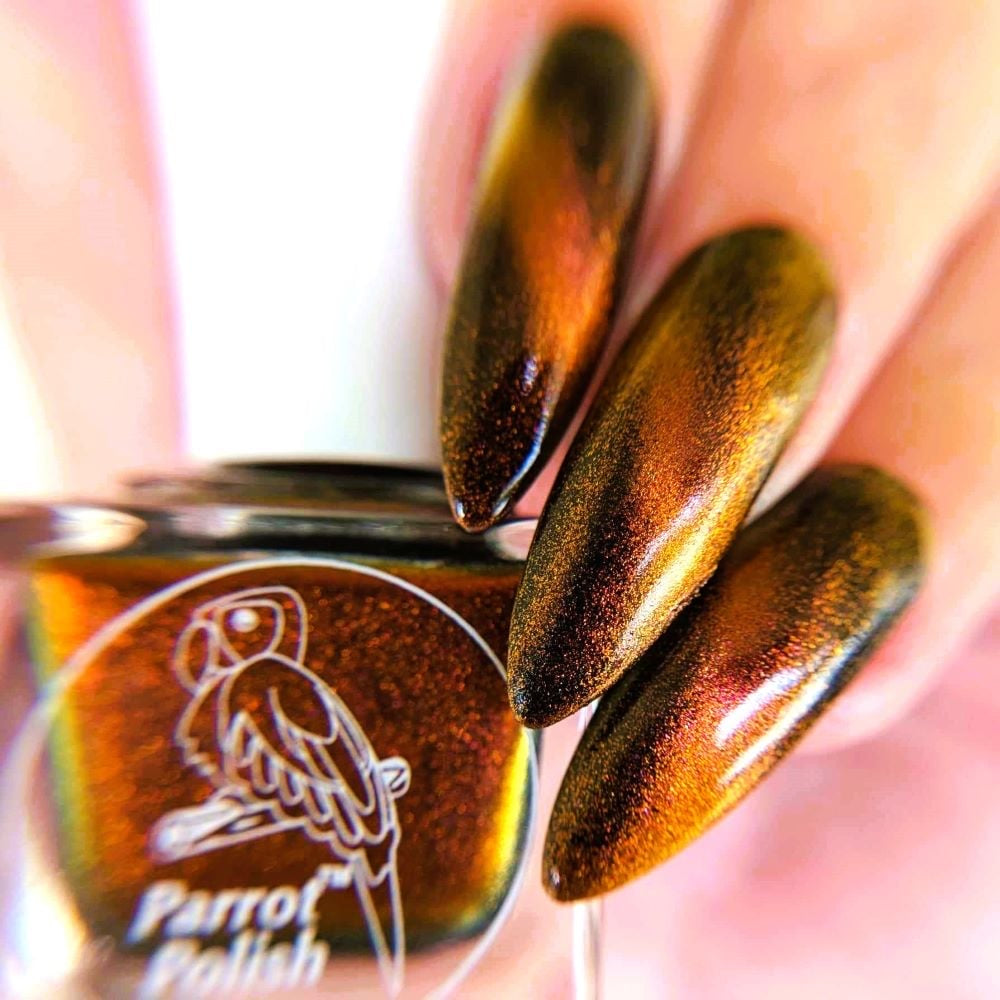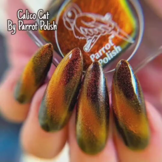Parrot Polish "Calico Cat " Multichrome Magnetic Nail Polish Brown/Black/Gold. An eye catching magnetic multichrome that moves from Brown/Black to Gold and several other colors, based on the lighting. Please use a Neodymium magnet for best results. 2-3 coats and a top coat is all you need.
