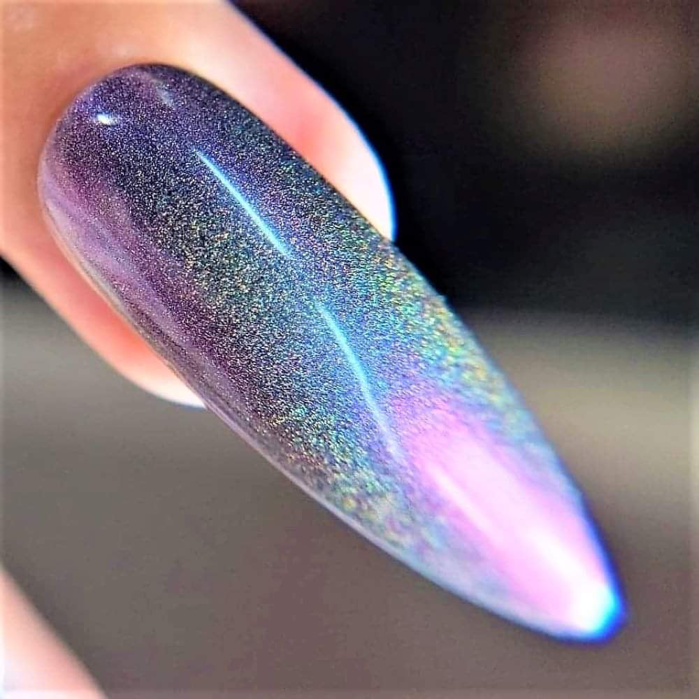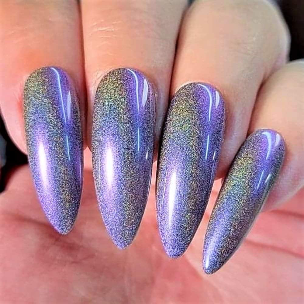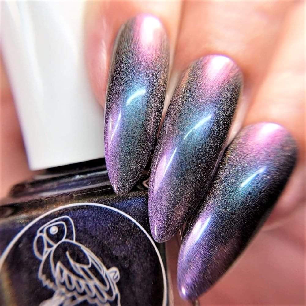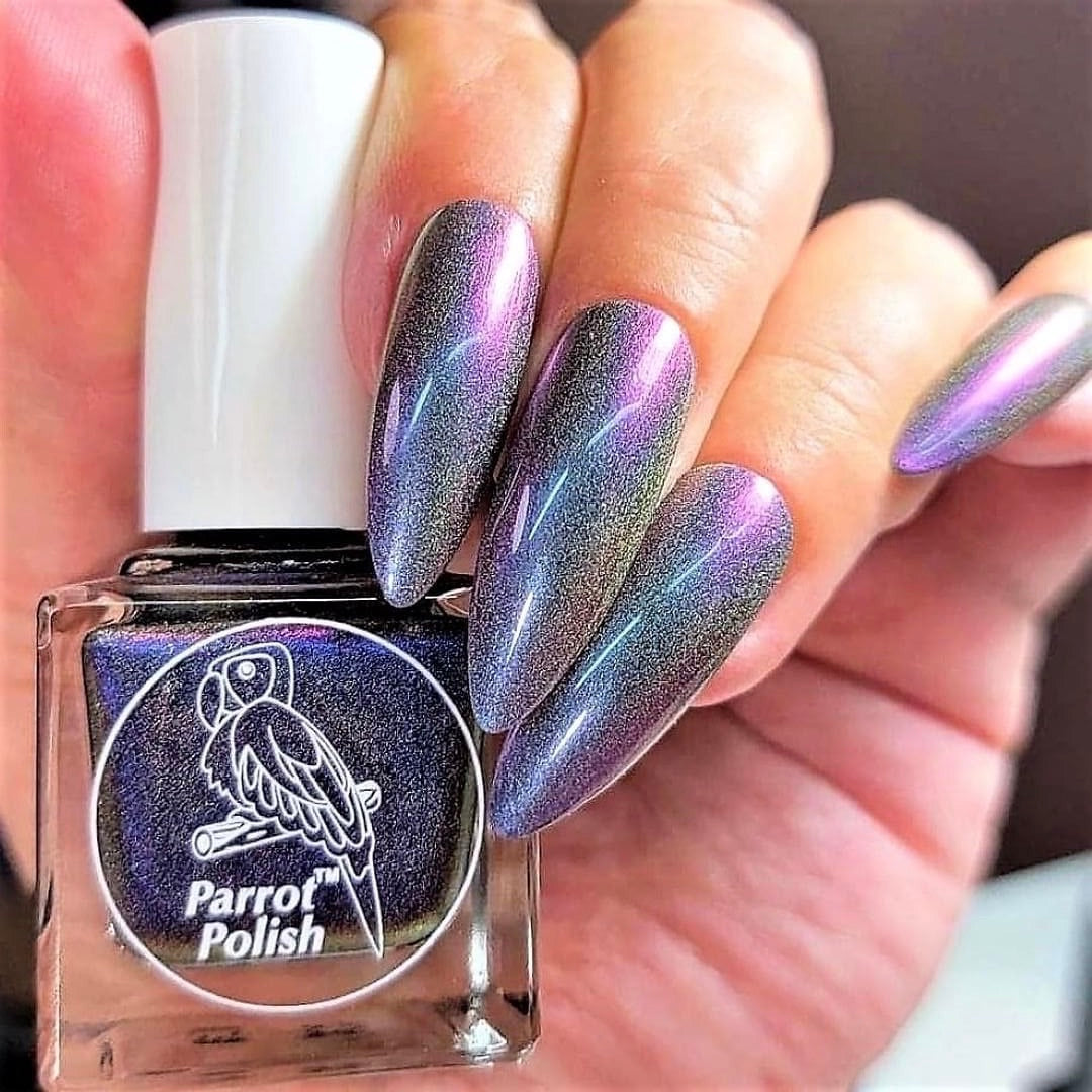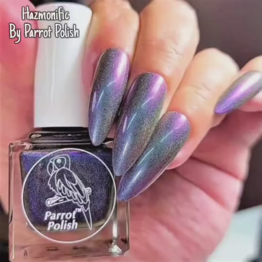 Shifting between purple, pink, and blue hues, Hazmonific is a super sparkly ultrachrome polish from our Magic Bus Collection. Inspired by Jimi Hendrix, this "Purple Haze" color-changing chrome polish creates brilliant nail art on both natural and acrylic nails. Our premium ultrachrome nail polish can be added in multiple coats for a deeper, more opaque color. Easy to apply, our line of color shifting ultrachrome nail polishes dry quickly with a sleek and smooth finish. Hazmonific holographic ultrachrome nail polish is non-toxic, cruelty-free, and 10-free, just like all of our Parrot Polish products.