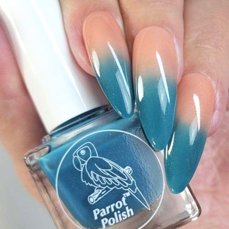 Parrot Polish Pink Sands is a thermal nail polish that evolves according to the temperature. When cool, this transitional polish is a Blue and when warm, it transforms to a Coral. Use this premium nail polish with various application techniques like water marbling to create colorful art on natural or acrylic nails. Our salon quality nail polish can be applied multiple times for more opaque color and dries to a matte finish. For a brilliant, high-gloss finish, use a clear top coat. Our line of thermal polishes are easy to apply, and dry quickly with a smooth finish. As with all of our Parrot Polish products, non-toxic Pink Sands thermal nail polish is cruelty-free and 10-free.