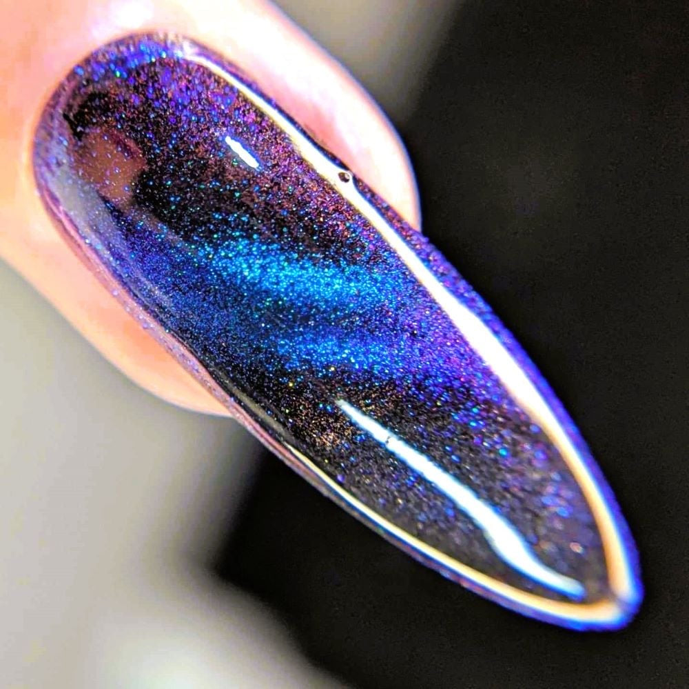 Parrot Polish "Siamese Cat" Multichrome Magnetic Nail Polish Blue/Purple. An eye catching magnetic multichrome that moves from blue to purple and several other colors, based on the lighting. Please use a Neodymium magnet for best results. 2-3 coats and a top coat is all you need.