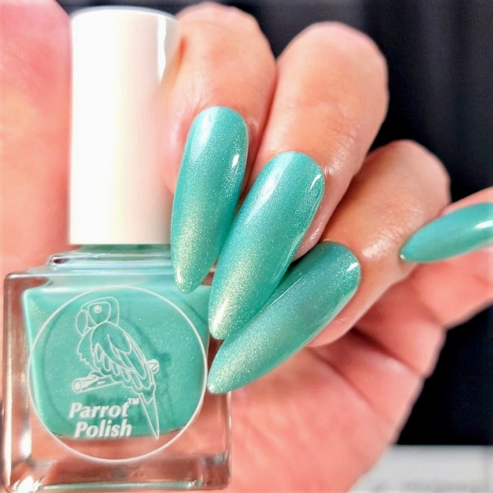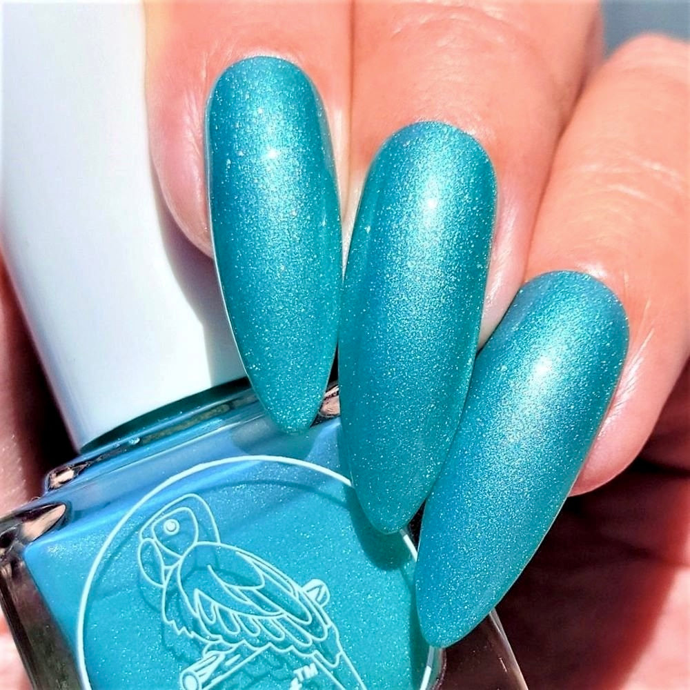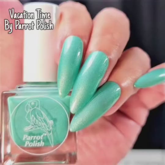 This Solar polish is a showstopper that transitions to a Sparkly Teal when in the sun. Our Vacation Time solar nail polish is a must-have polish for any collection and is excellent on both natural and acrylic nails. This two-tone polish features colors that blend beautifully and can be used in various application techniques to create gorgeous manicures that change color when exposed to sunshine or UV light. Our premium solar polish can be applied in multiple coats for deeper, more opaque colors. The salon-quality solar nail polish dries to a semi matte finish, but can be finished off with a clear top coat for brilliant shine. Our line of nail polishes are easy to apply, and dry quickly with a smooth finish. Vacation Time solar nail polish is non-toxic, cruelty-free, and 10-free, just like all of our Parrot Polish products.