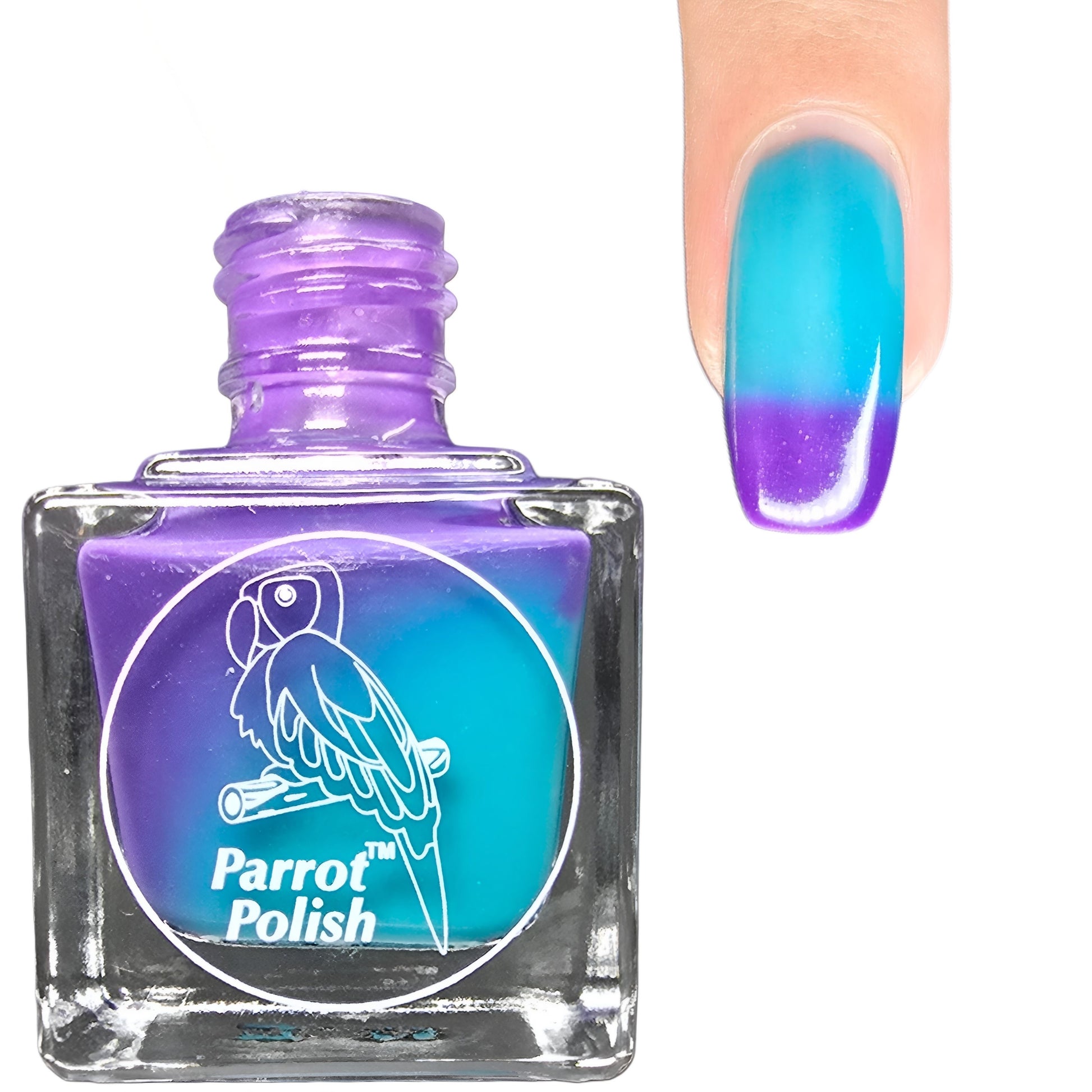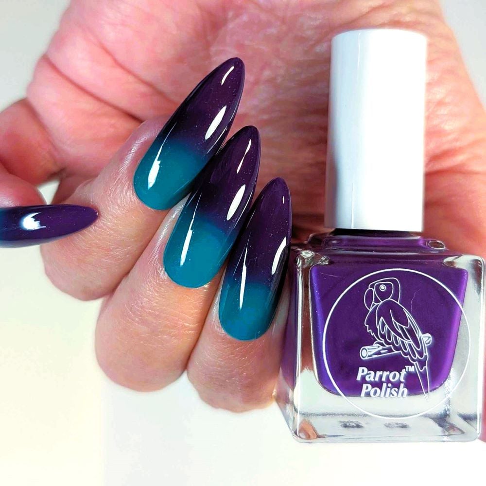 Inspired by a the beauty of a Lilly, Purple Lilly Explosion begins as a deep purple cold and then transforms to a blue green when it gets warmer. With a hint of sparkle, this premium temperature-based polish features chrome dust for an extra pop and is suitable for natural or acrylic nails. Add multiple coats to create an even deeper, more opaque color. This vibrant polish provides a bold color combination for optimal dramatic effect, and it can be used with various application techniques like water marbling to create gorgeous nail art. A salon quality nail polish, it dries to a matte finish, but add a clear top coat for a high-gloss brilliant shine. Our line of thermal polishes are easy to apply, and dry quickly with a smooth finish. As with all of our Parrot Polish products, non-toxic Purple Gum Paste thermal nail polish is cruelty-free and 10-free.
