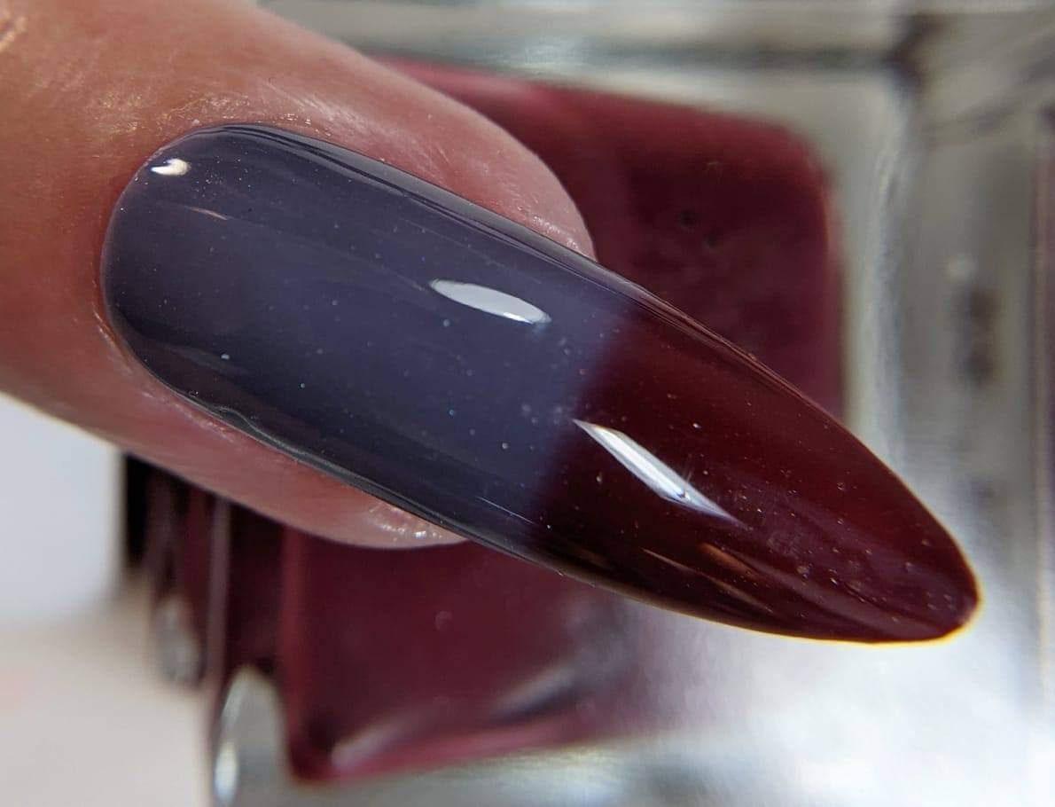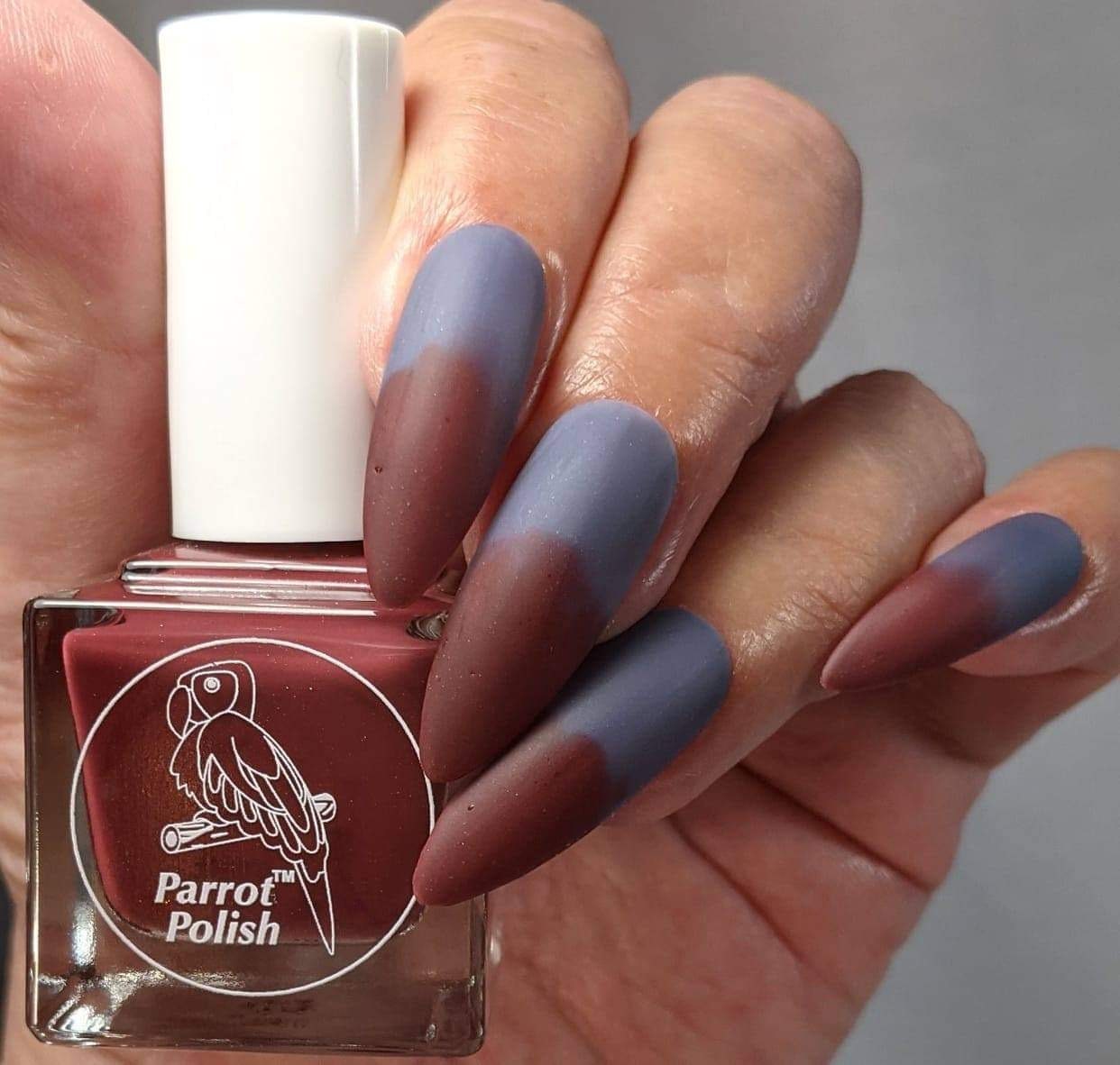 A dramatic accessory for your nails, our Red Dragon thermal nail polish is a dual color polish that transforms from a dark red to greyish purple when it's hot. This vibrant temperature-based polish is suitable for both natural and acrylic nails and it can be layered for a deeper, more opaque color combination. Our premium nail polish offers a bold color combo for optimal drama, and it can be used with various manicure styles and techniques like water marbling to create nail art. Our salon quality nail polish dries to a matte finish, but add a clear top coat for a sophisticated, high-gloss shine. Our premium line of thermal polishes are easy to apply, and dry quickly with a smooth finish. As with all of our Parrot Polish products, non-toxic Red Dragon thermal orange nail polish is cruelty-free and 10-free.