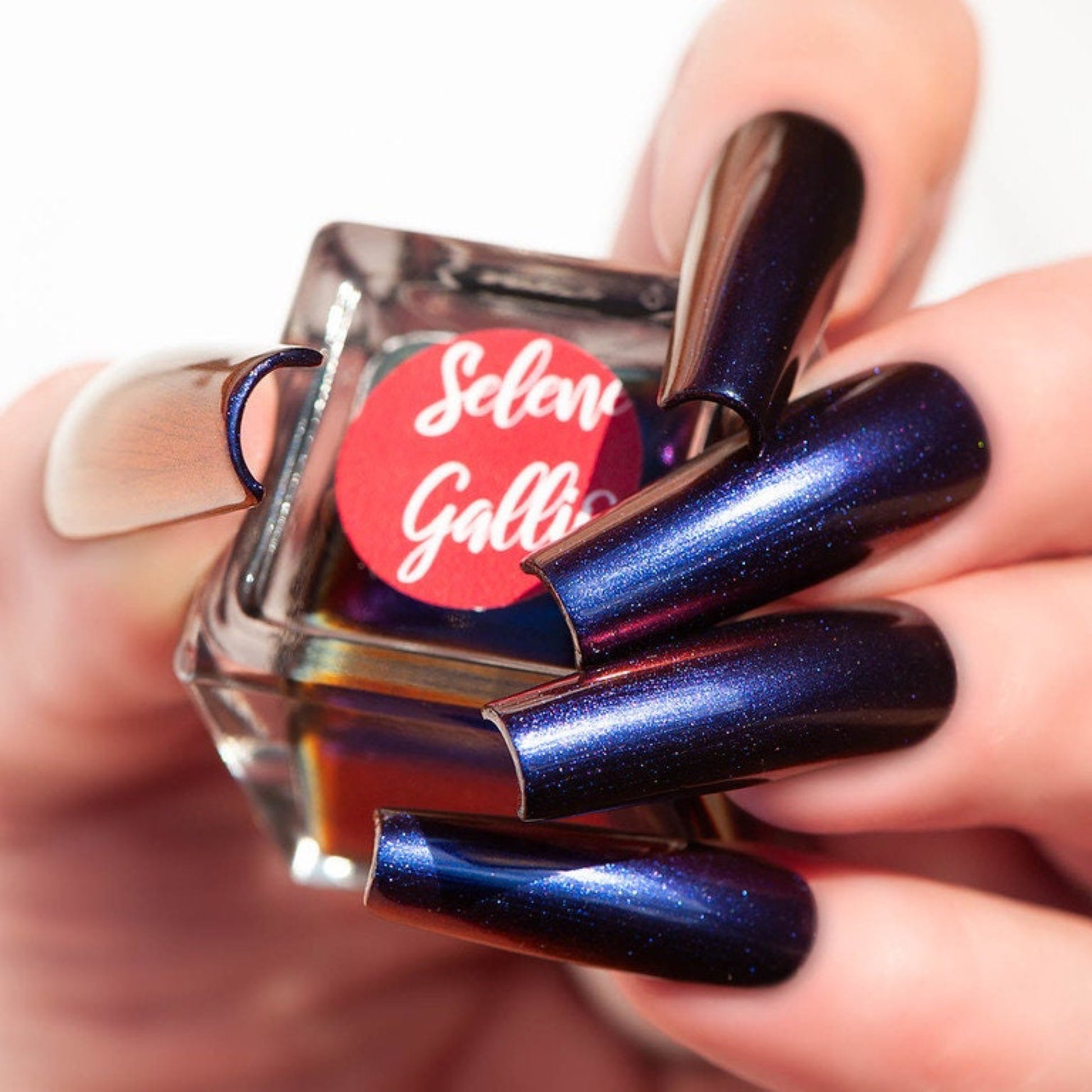 A dark multichrome from our Famous Vampire Collection, Selene Gallio nail polish is a beautiful blue and purple with brilliant specks of red and orange. This ultrachrome polish is named after Selene Gallio, a sexy vampire from comic books and the Underworld series. Our vibrant polish creates a captivating manicure or unique nail art on either natural or acrylic nails. A premium ultrachrome, the color-morphing polish can be applied in multiple coats for a darker, more opaque color. Easy to apply, our line of gorgeous ultrachrome nail polishes dry quickly with a smooth finish. Add a clear top coat for a brilliant high-gloss finish. Selene Gallio ultrachrome nail polish is non-toxic, cruelty-free, and 10-free, just like all of our Parrot Polish products.