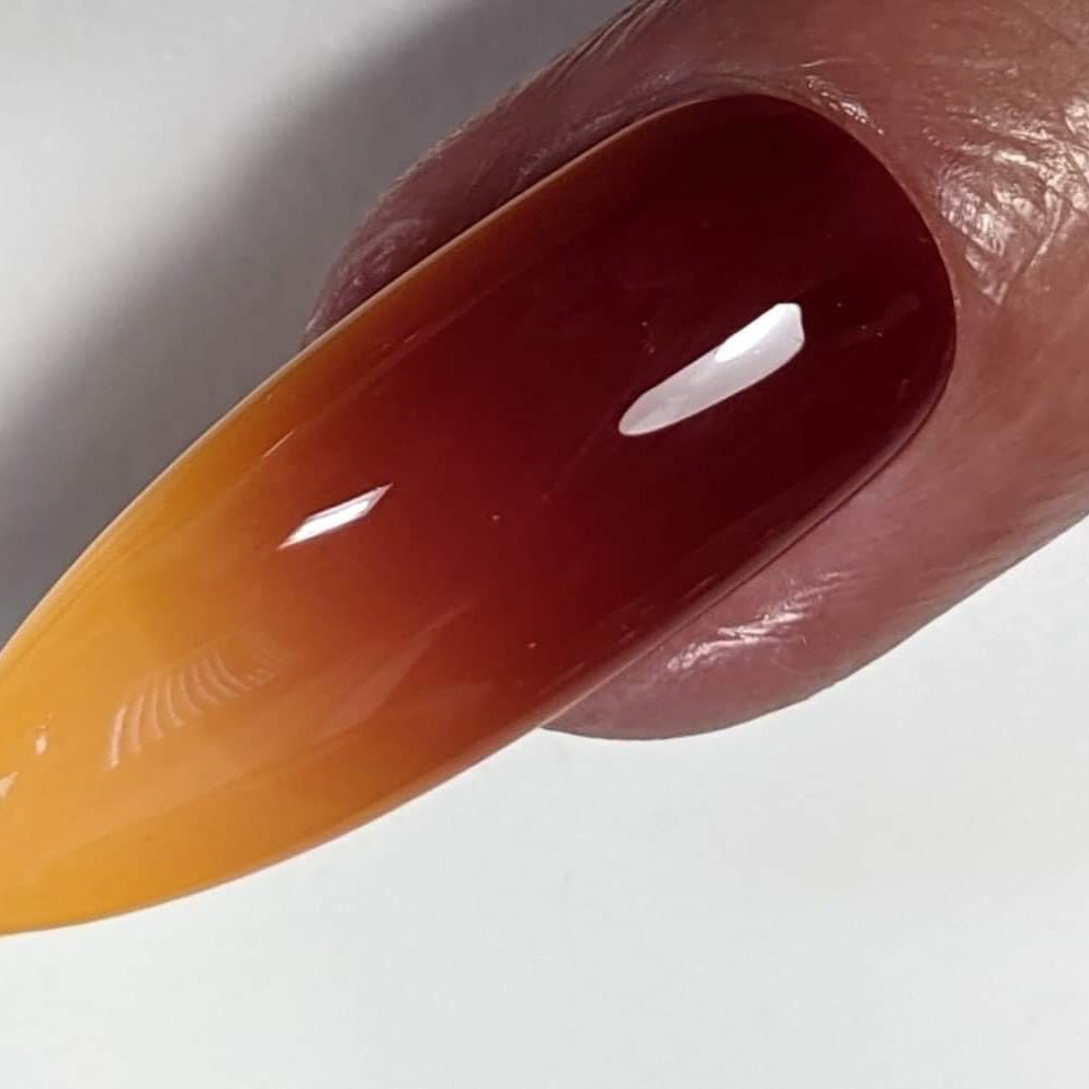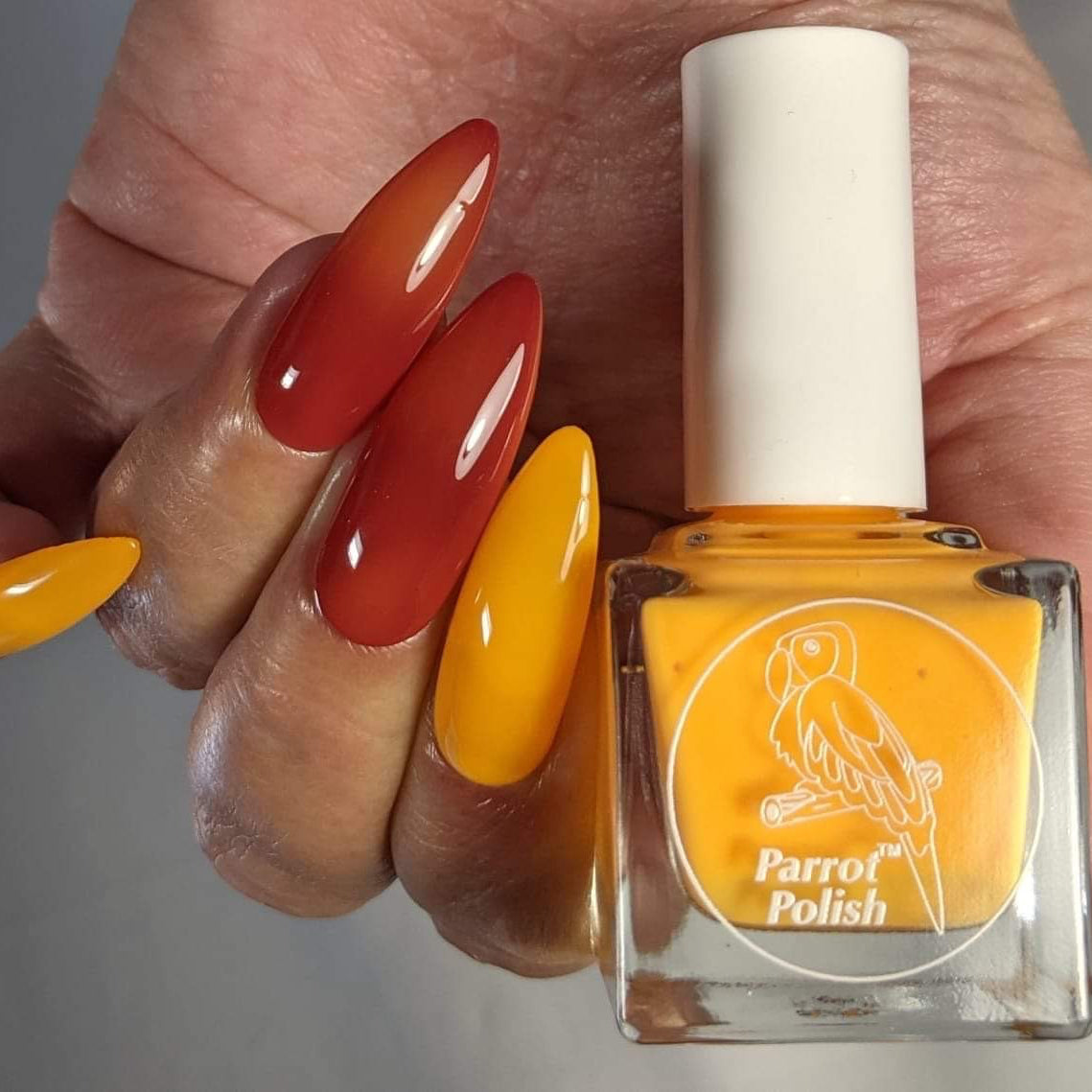 Enjoy the colors of dusk with our Sunset Burn solar nail polish that changes color when exposed to sunshine or UV light. Our owner's favorite solar polish, it is a vibrant yellow-orange when in the shade and transforms to red when in sunlight. The eye-catching color combination create a gorgeous manicure and the polish can be used with various application techniques to create gorgeous nail art. Our premium color-changing solar polish can be layered with multiple coats for deeper, more opaque colors on both natural and acrylic nails. This salon-quality solar polish dries to a matte finish, but enhance the glossy shine with a clear top coat. Our line of solar nail polishes are easy to apply, and dry quickly with a smooth finish. Sunset Burn solar nail polish is non-toxic, cruelty-free, and 10-free, just like all of our Parrot Polish products.
