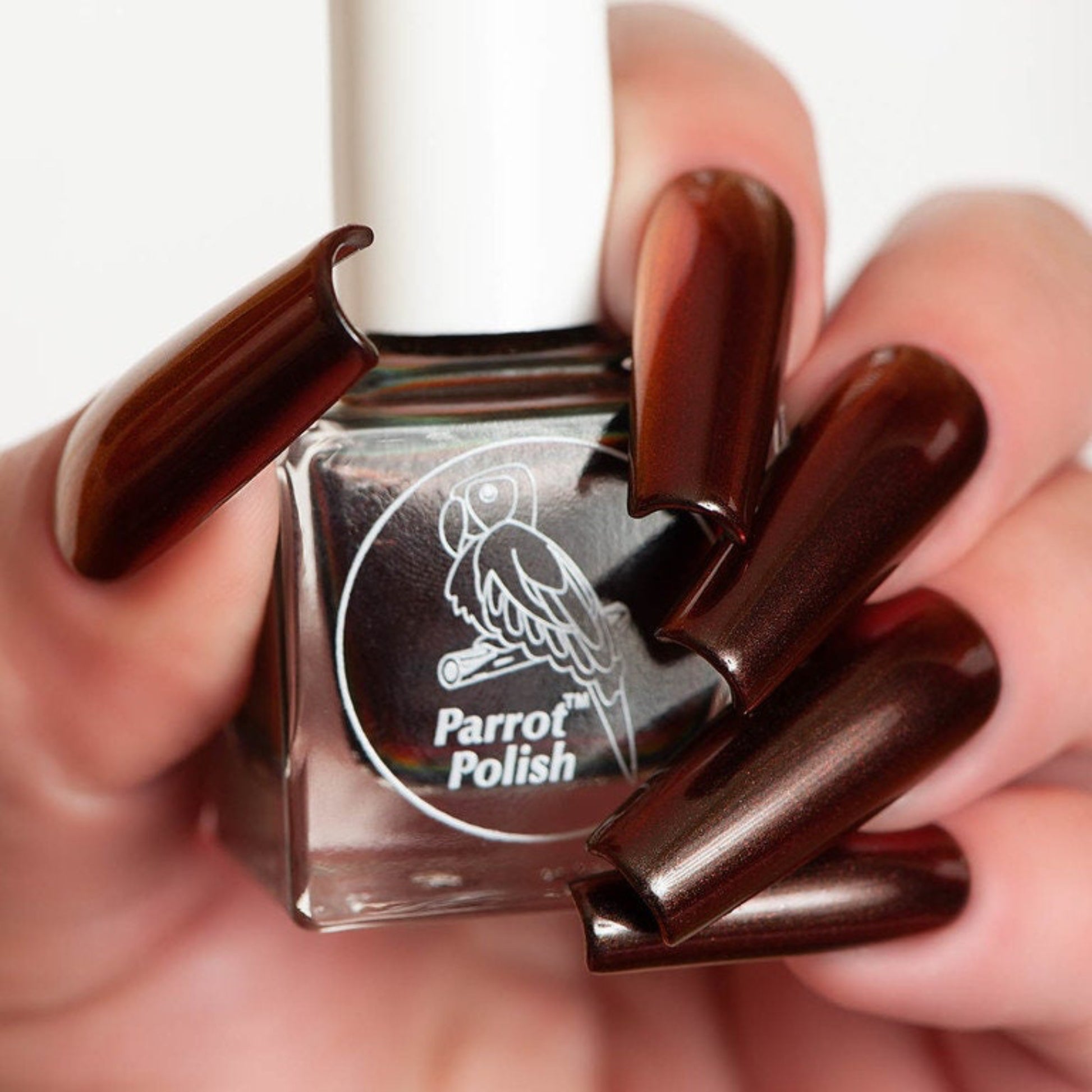 Sweet Claudia ultrachrome polish is a bold black red that shifts into tones of gold and orange from our Famous Vampire Collection. This chrome polish is named after the sweet but cunning Claudia from Interview With a Vampire. Our brilliant and bright polish creates an eye-catching manicure and nail art on both natural and acrylic nails. Our premium red ultrachrome polish can be layered with multiple coats for a deeper, more opaque color. Easy to apply, our line of gorgeous ultrachrome nail polishes dry quickly with a smooth finish. Add a clear top coat for a brilliant high-gloss finish. Sweet Claudia ultrachrome nail polish is non-toxic, cruelty-free, and 10-free, just like all of our Parrot Polish products.