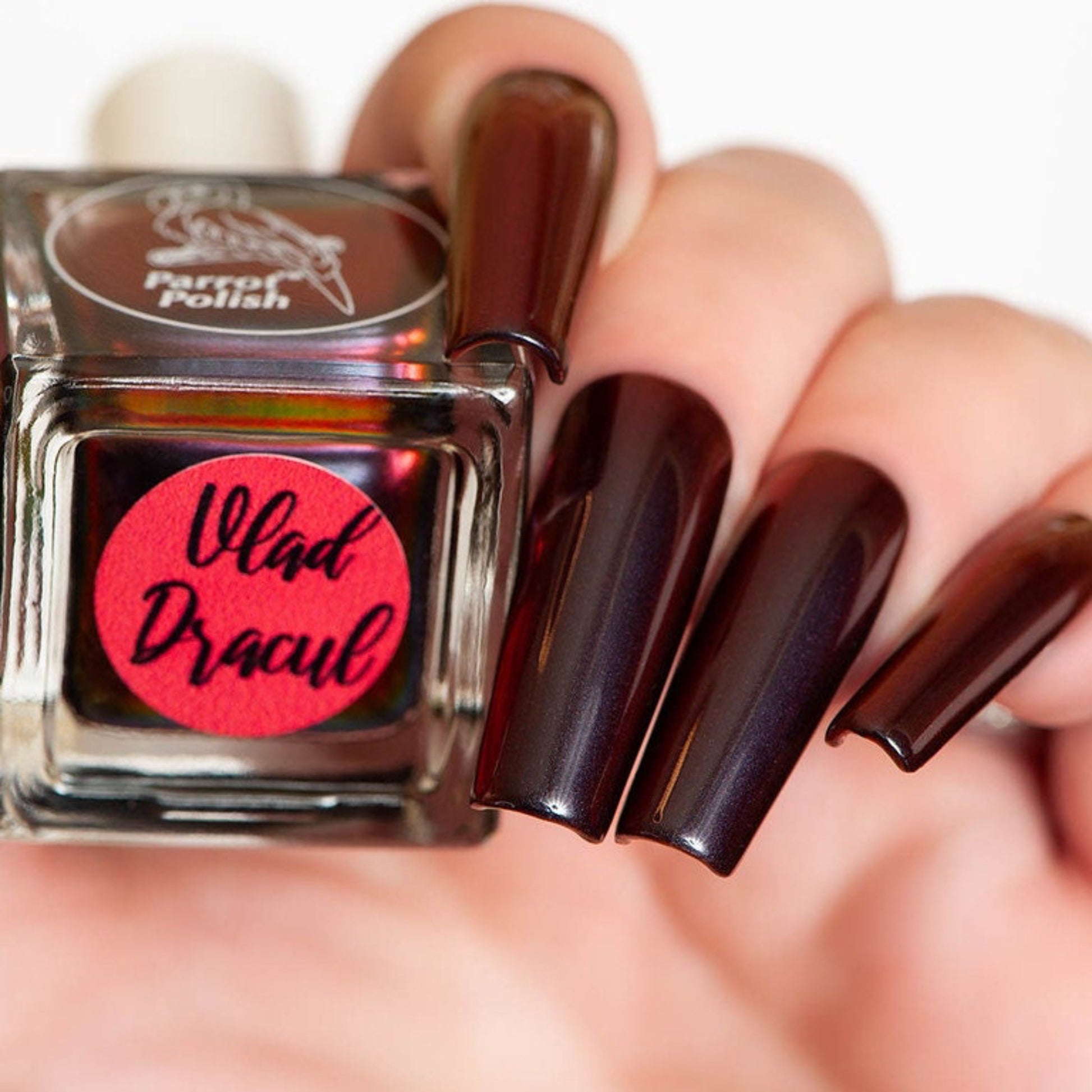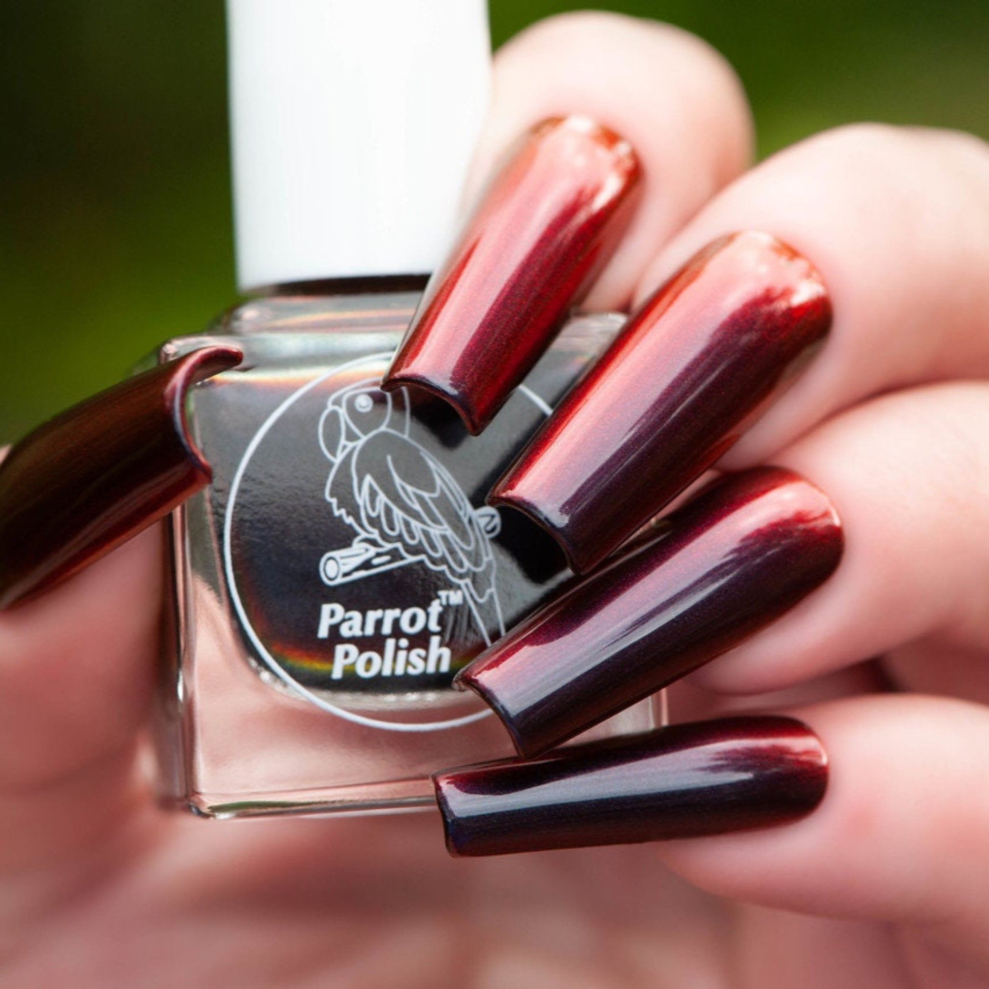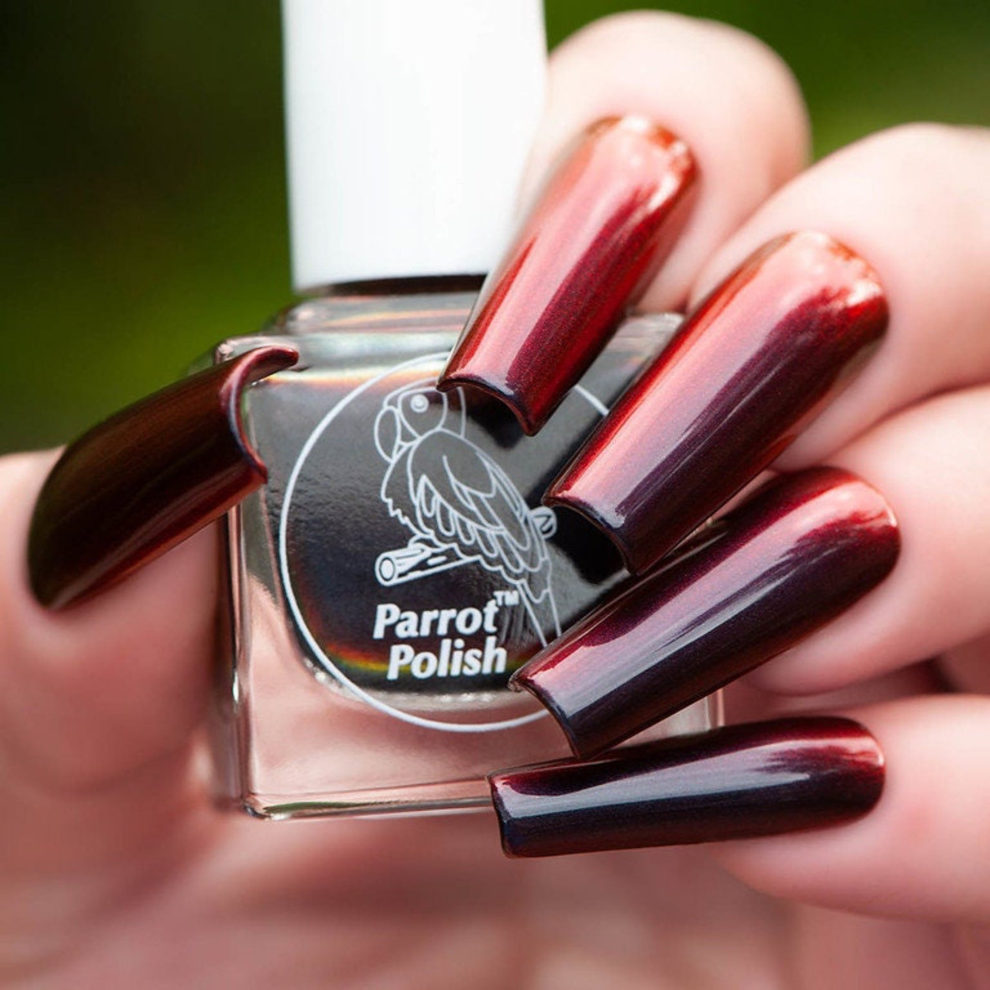 Part of our Famous Vampire Collection, Vlad Dracul ultrachrome polish is a deep reddish-black that features flashes of orange and gold. This chrome polish is named after Vlad Dracul, the notorious father of Vlad the Impaler. Our deep red polish creates a captivating manicure, or use it for unique nail art on both natural and acrylic nails. This premium ultrachrome multi-color polish can be layered for a darker, more opaque color. Easy to apply, our line of gorgeous ultrachrome nail polishes dry quickly with a smooth finish. Add a clear top coat for a brilliant high-gloss finish. Vlad Dracul ultrachrome nail polish is non-toxic, cruelty-free, and 10-free, just like all of our Parrot Polish products.